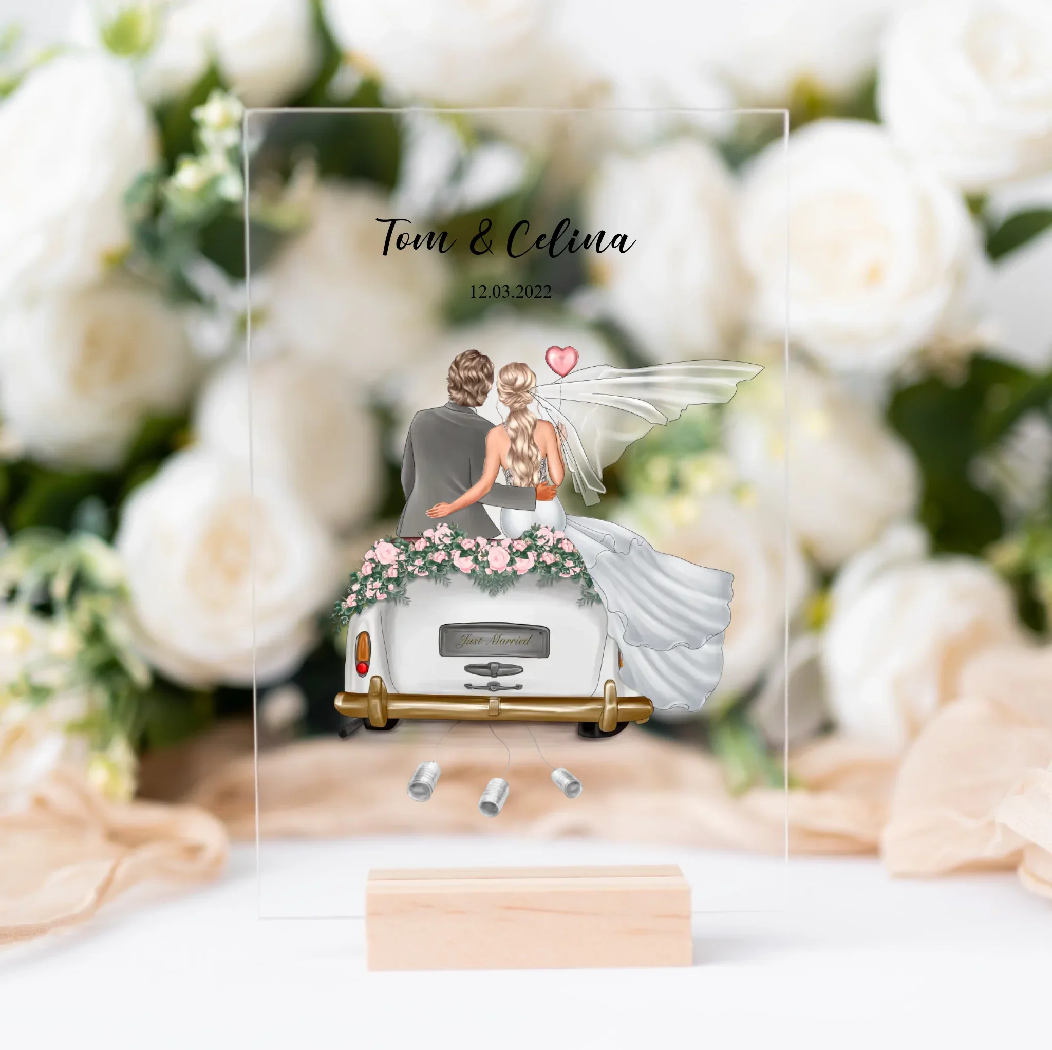 Ein romantischer Moment für die Ewigkeit: Diese charmante Acryltafel zeigt ein Brautpaar, das gemeinsam in ein neues Kapitel startet – stilvoll inszeniert auf einem nostalgischen Auto mit „Just Married“-Detail. Du kannst Hauttöne, Frisuren und weitere Details frei wählen, um das Paar individuell zu gestalten. Ideal als Hochzeitsgeschenk, Deko für die Hochzeitsfeier oder als bleibendes Erinnerungsstück fürs gemeinsame Zuhause.