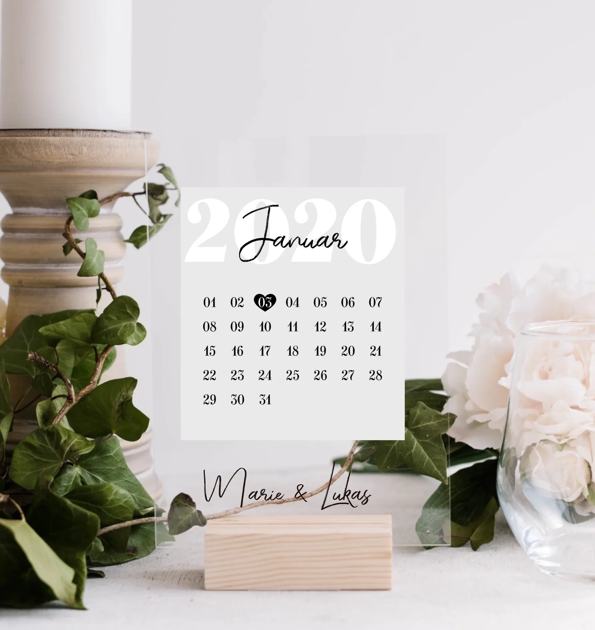 Diese Acryltafel zeigt ein Kalendermotiv, auf dem ein individuell wählbares Datum hervorgehoben ist. Zusätzlich können zwei Namen ergänzt werden. Die Darstellung erfolgt im gewählten Jahr und Monat. Die Tafel ist optional mit einem Holzfuß zur Aufstellung erhältlich.